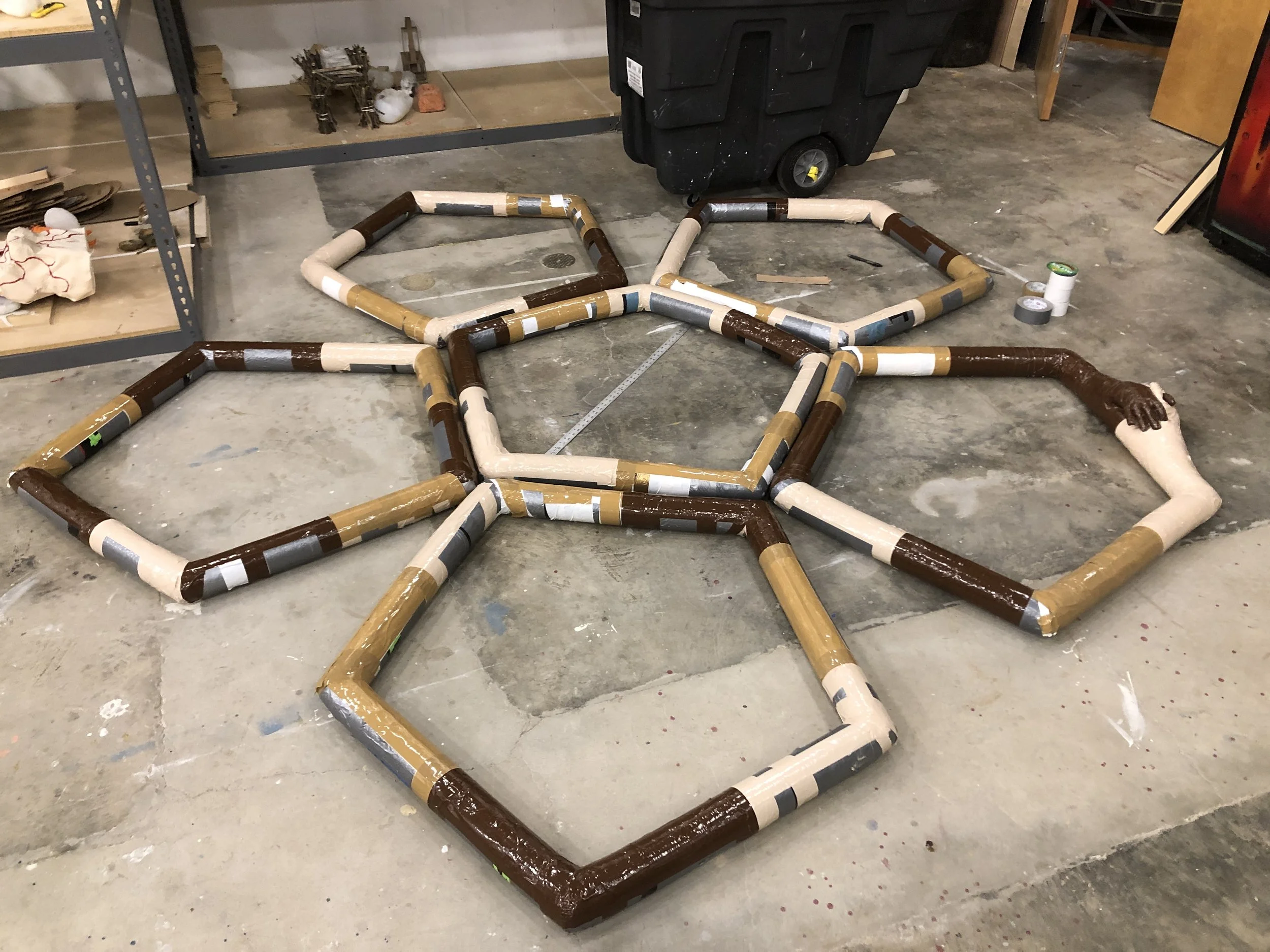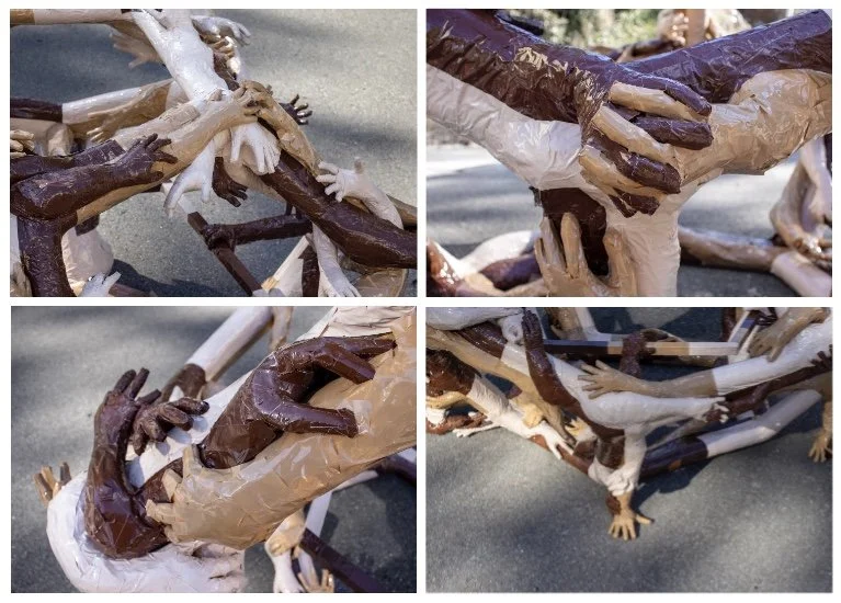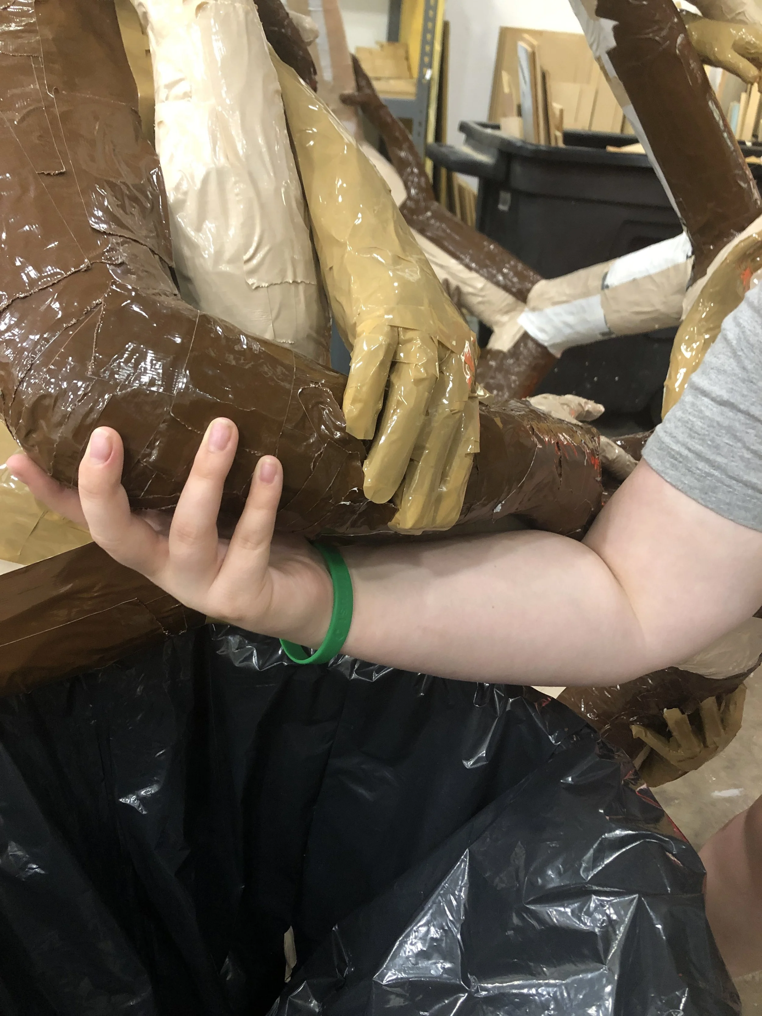 During Quarantine, I volunteered to stay on campus as a residential life assistant without residents. We were tasked with walking the dorms and waiting for our students return to campus. One day, I took duct tape and wrap it around my arm to make a arm casting. I felt like I was giving a hug to myself. Most of the hands casted for the sculpture are my own, but after returning to campus a few of my friends partook in modeling for me. Duct tape can be worked like fabric and has its own memory. I can shake hands and have a visceral feeling for my hand without the physical presence of my hand. A few of my international friends who weren’t able to return to campus for Fall 2020 casted their hands with me. A memory of them is still here with me in Unity Ball.