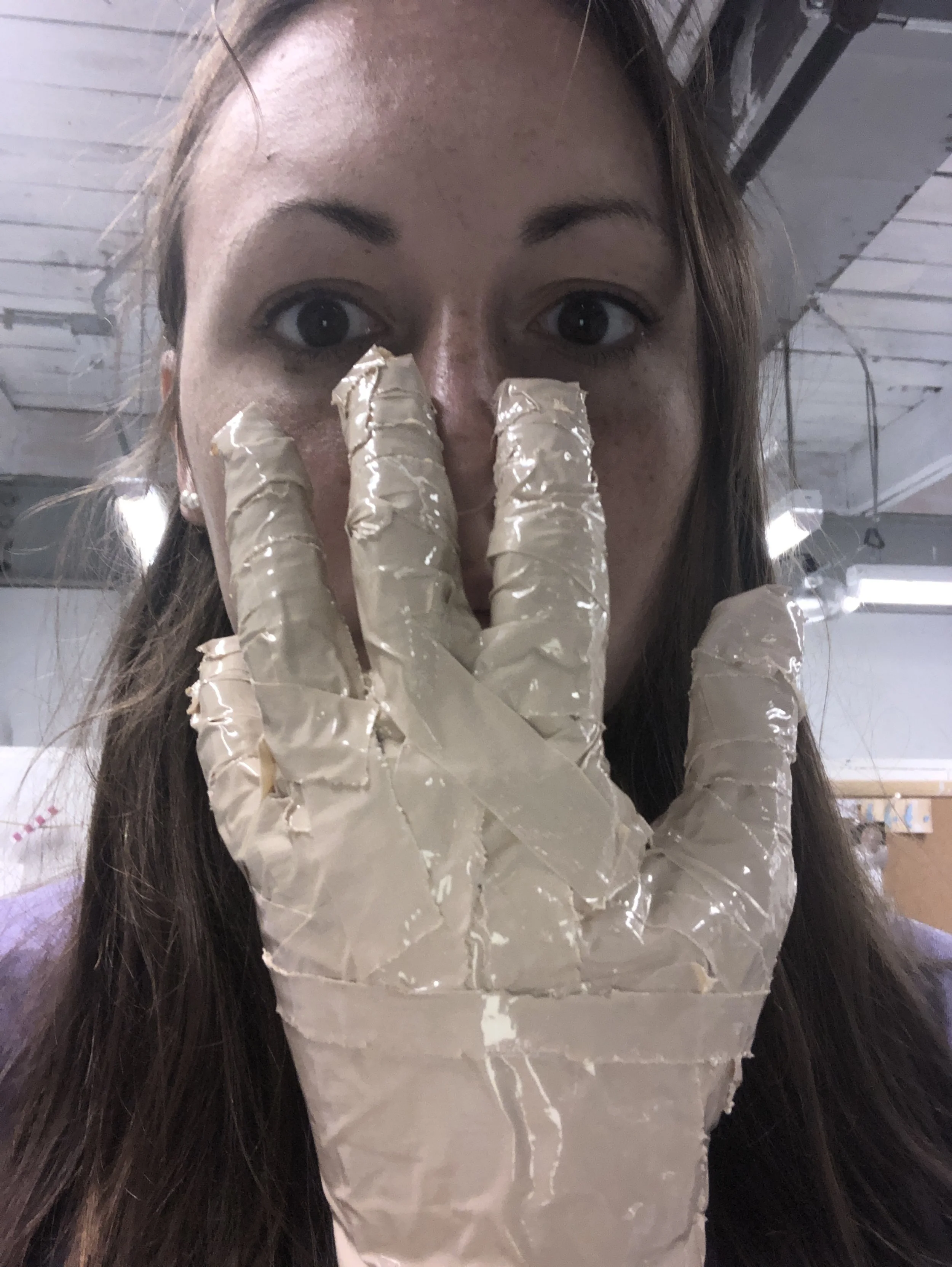 Soon enough my coursework for the remainder of the semester was moved online and cut in half. At the time, I needed to figure out what I would be concentrating on for my senior thesis show. After ruling out creating artwork for my own animated short I landed upon the huge impact technology and art had on my health during the Covid 19 Crisis. I was playing around with linked arms overlayed on app icons which eventually became Enlarged Phone when I decided to make my first duct tape arm casting. I had made a plaster arm casting before, but this material was different. The sticky fabric held together with little to no cleanup and remembered the items I casted. Every time I made an arm casting it felt like I was giving myself a hug. I soon became comforted by the noise of tearing duct tape.